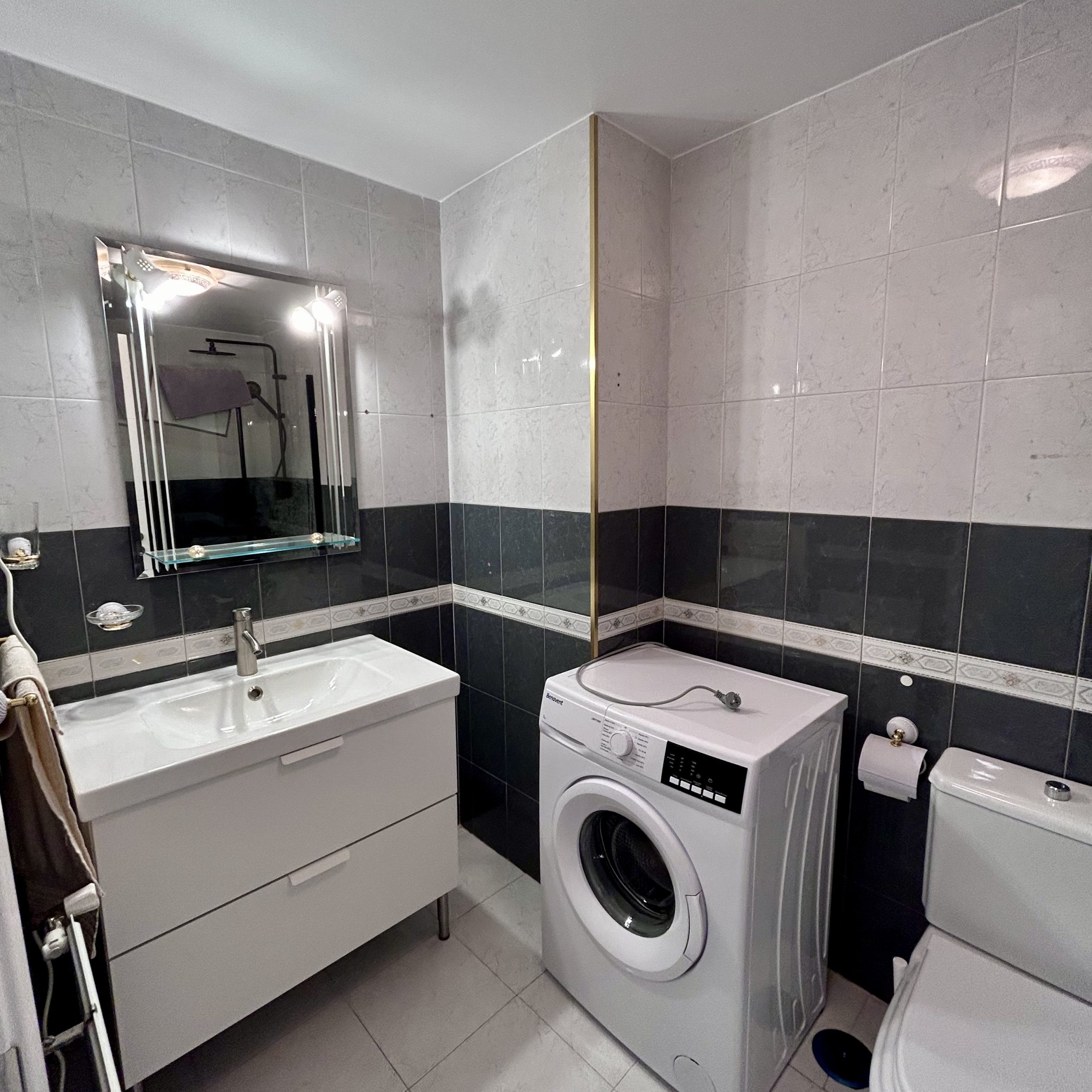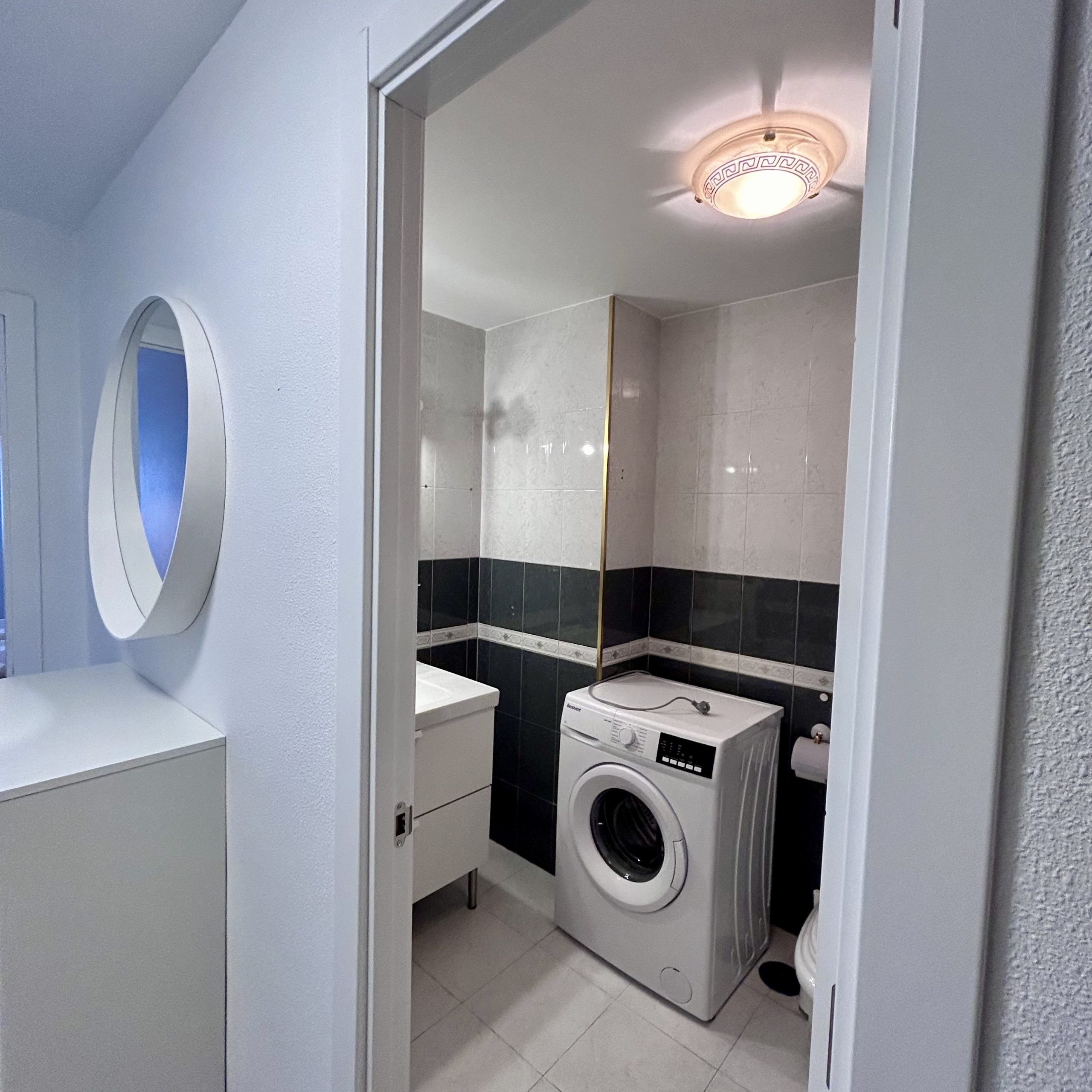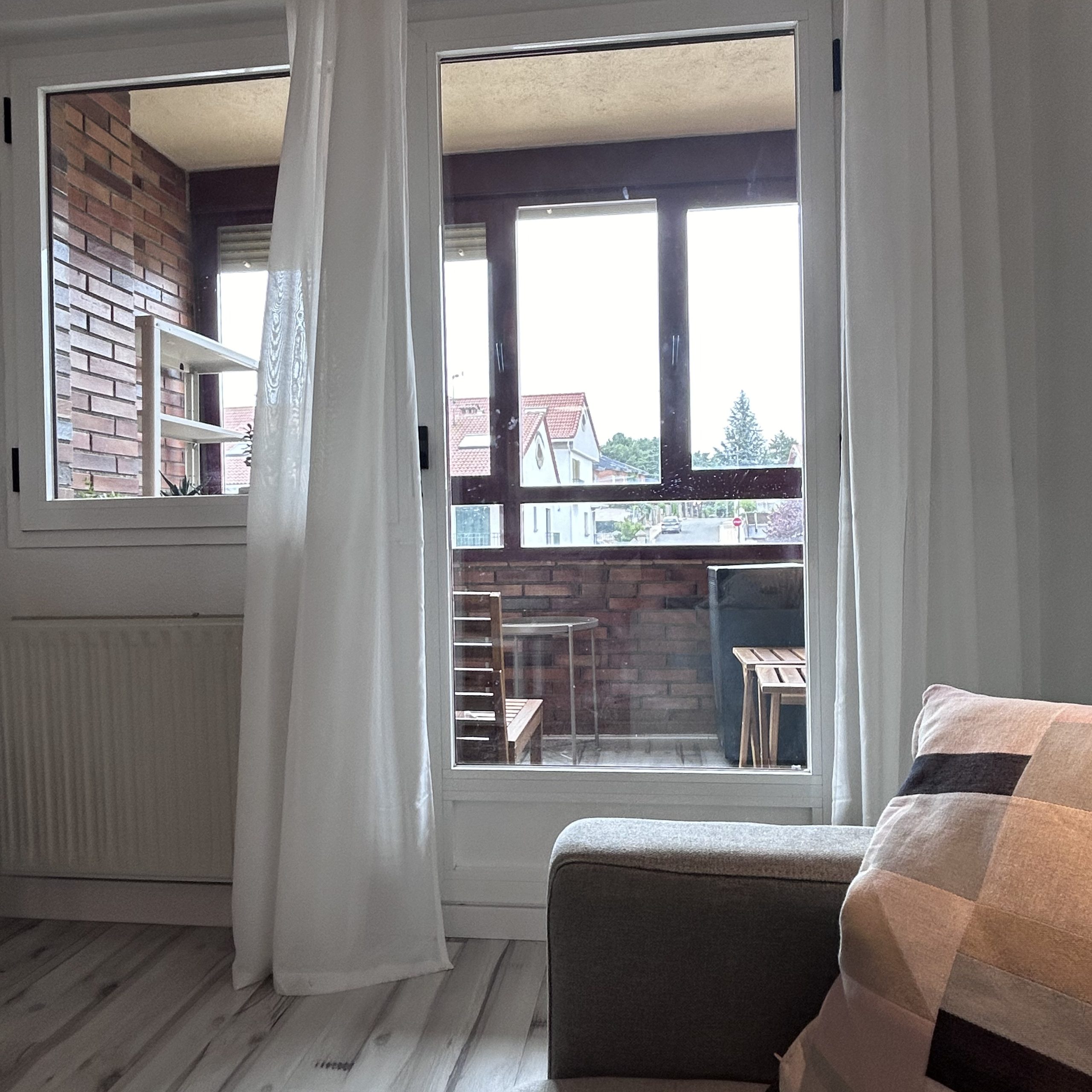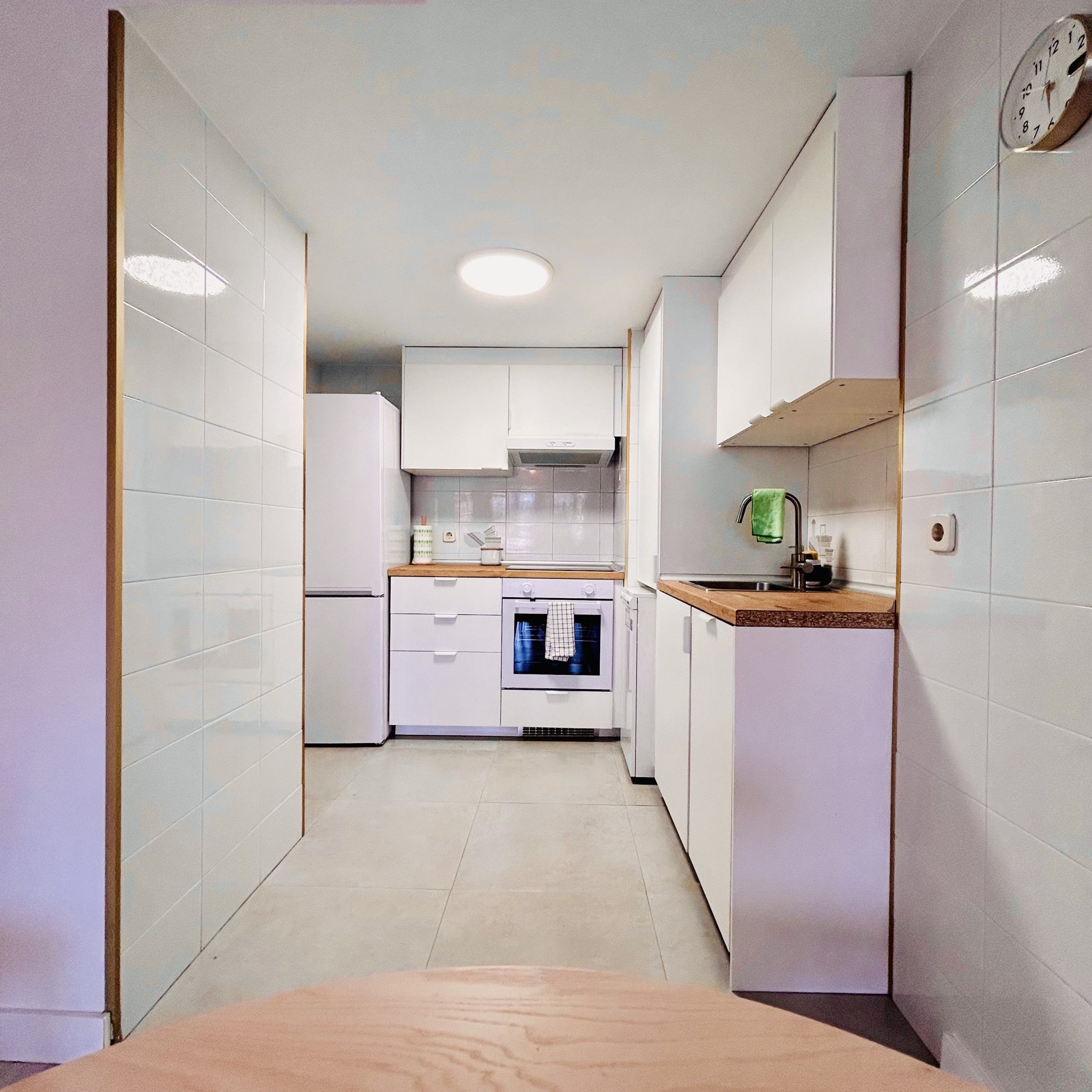 Salón con sofá cama-cocina equipada- 1 habitación doble, 1 baño y 1 terraza y ascensor, 60 m2.
