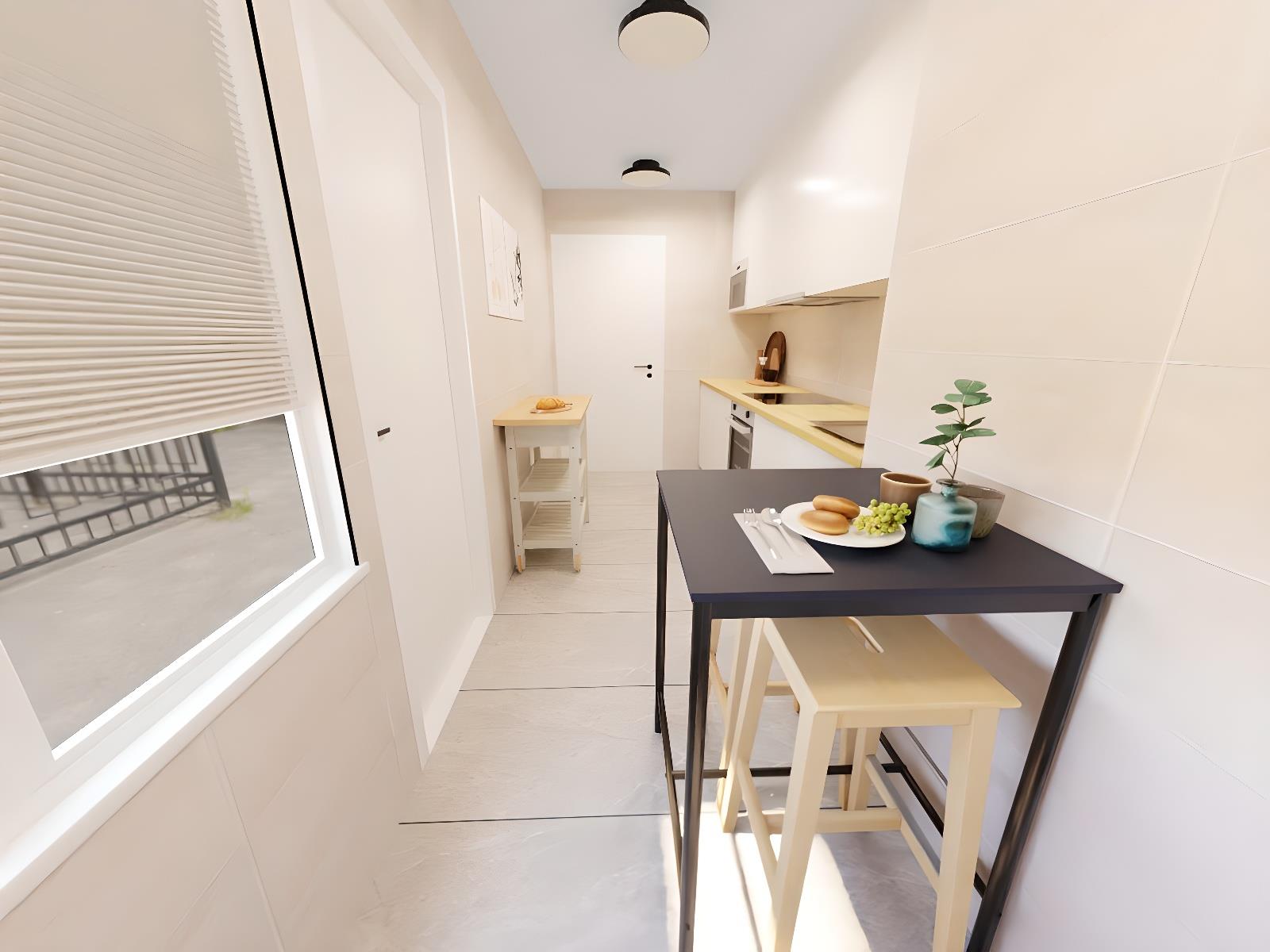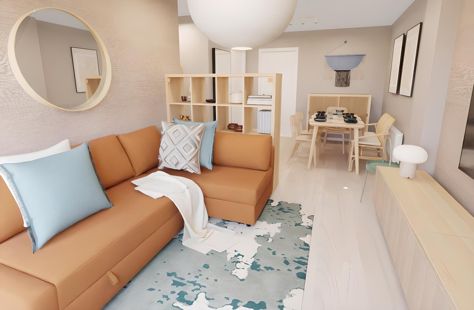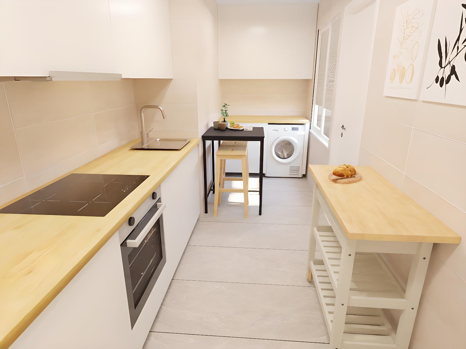 Salón (con sofá cama)-comedor y Cocina equipados-1 baño-2 habitaciones-1 balcón -1 patio interior, adaptado a minusválidos y ascensor.