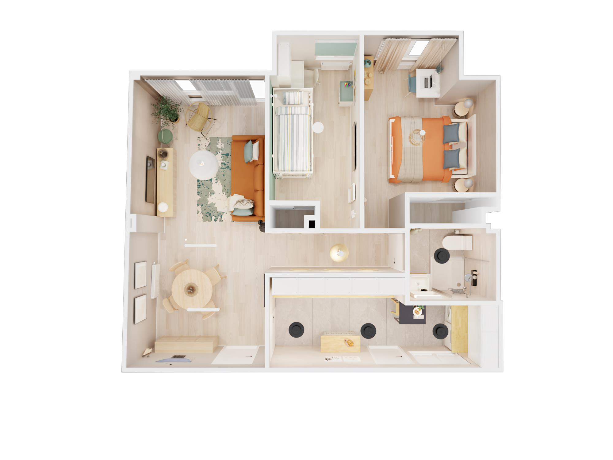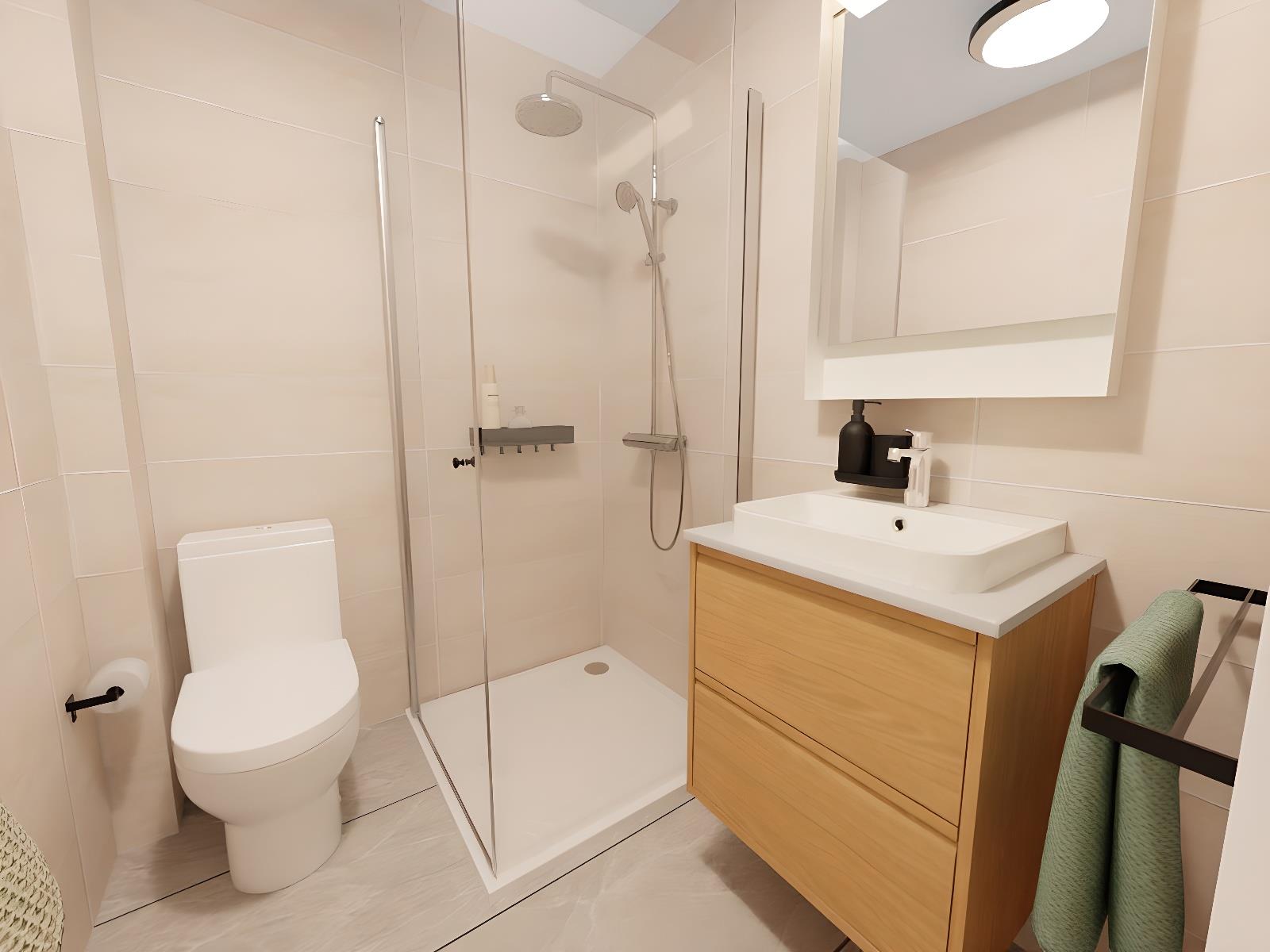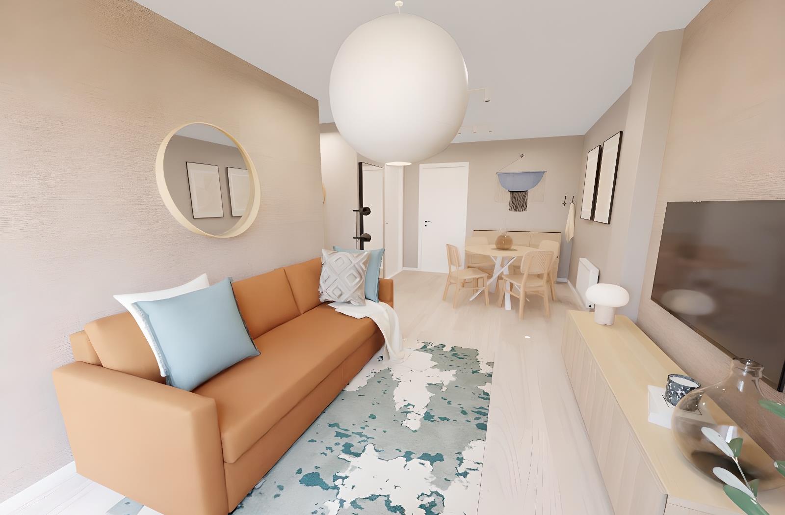 Salón (con sofá cama)-comedor y Cocina equipados-1 baño-2 habitaciones-1 balcón -1 patio interior, adaptado a minusválidos y ascensor.